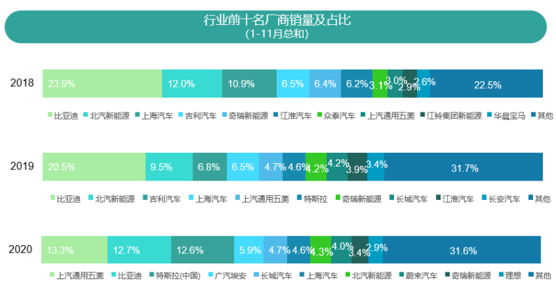 圖 | 2020年1-11月新能源車企銷量Top10占比(數(shù)據(jù)來源:威爾森監(jiān)測)
