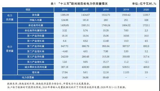 從全省用電結(jié)構(gòu)來看,第二產(chǎn)業(yè)尤其是高能耗高排放工業(yè)用電在全社會用電量中占絕對主導(dǎo)地位,占比約為53%。第三產(chǎn)業(yè)用電量雖然小于第二產(chǎn)業(yè),但是已經(jīng)成為拉動全省用電量增長的主要動力,2015~2019年平均增長率為11.74%,遠(yuǎn)高于第一和第二產(chǎn)業(yè)。從電力供應(yīng)情況來看,湖南省電力供應(yīng)來源為該省電源發(fā)電和跨區(qū)跨省輸入電量兩部分。截至2019年底,湖南本省發(fā)電量為1559.42億千瓦時,跨區(qū)跨省輸入清潔能源電量為244億千瓦時。從整體來看,“十三五”期間湖南省電力供應(yīng)量與電力需求量保持基本平衡,甚至在部分年份電力供應(yīng)量略有富余,因此從全年電力供需情況來看,湖南省供電量是充足的(見表1)。