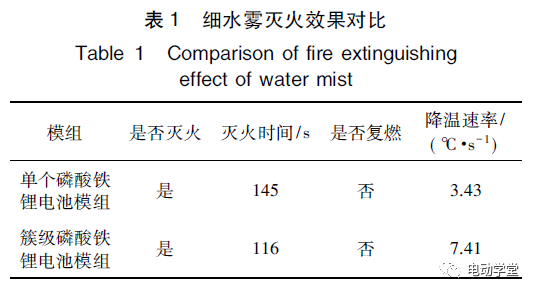 (3)細水霧滅火特性,具體滅火效果對比見表1?可知,在2次試驗中,模組燃燒后,細水霧都可以在短時間內(nèi)有效撲滅電池火災,但由于電池內(nèi)部仍存在化學反應,溫度出現(xiàn)回升,且簇級磷酸鐵鋰電池模組散熱差積熱嚴重,故回升溫度相較于單個磷酸鐵鋰電池模組更高?此后細水霧持續(xù)噴射,溫度持續(xù)下降,且無復燃現(xiàn)象出現(xiàn),具有極好的電池降溫和阻止復燃的效果?