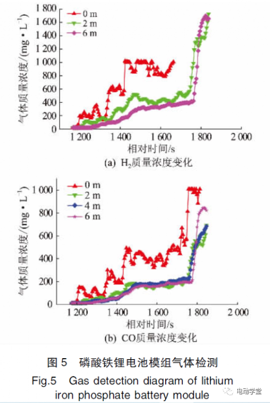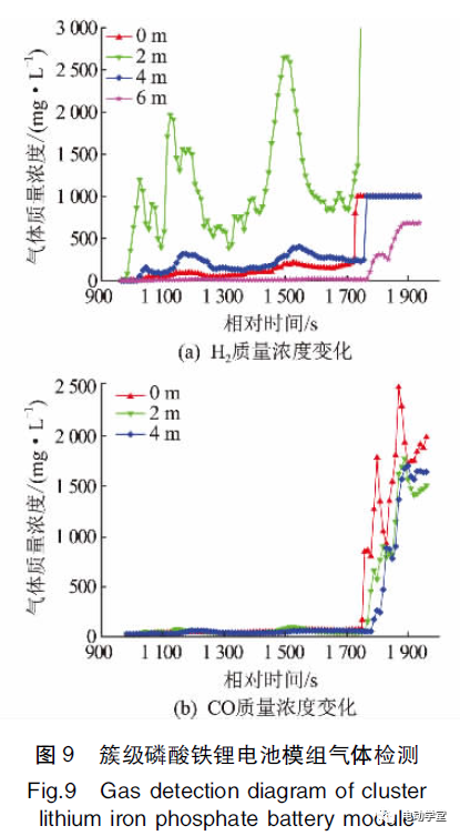 (2)熱失控氣體特性?單個磷酸鐵鋰電池模組過充后,0m處探測器最先探測到氣體濃度變化,然后依次是2m,4m,6m處氣體濃度改變,特征氣體呈現(xiàn)明顯的由近及遠擴散的規(guī)律,距離過充模組越近,能夠越早探測到對應氣體含量的提升,且相同時刻下,距離模組越近氣體濃度越高?而簇級磷酸鐵鋰電池模組過充后,特征氣體的擴散規(guī)律不盡相同,2m處探測器首先探測到氣體濃度變化,然后依次是4m,0m,6m處探測器,說明該環(huán)境下H2的擴散并非垂直向上,故在真實儲能艙內(nèi)進行消防預警時需要多點布置,并提高探測器精準度?