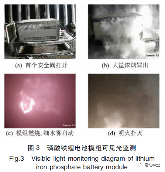 分別以0.5C,172A恒流對單個磷酸鐵鋰電池模組和簇級磷酸鐵鋰電池模組進行充電,電池發(fā)生熱失控后,停止過充,啟動細水霧進行滅火,并通過可見光?熱電偶?氣體探頭等對模組過充至熱失控及滅火過程進行實時監(jiān)控?