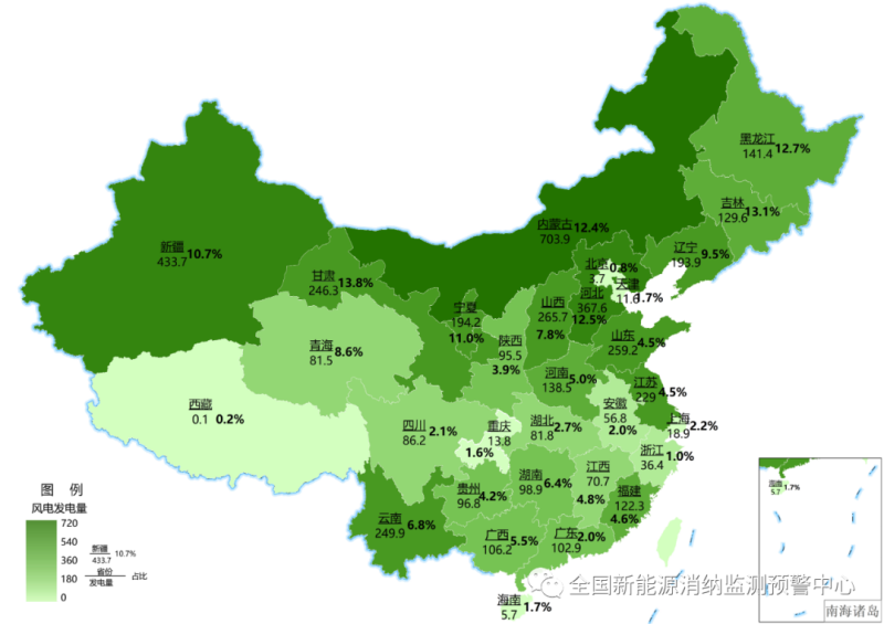 2020年,全國風電項目發(fā)電4665億千瓦時,同比增長約15%;各省累計風電發(fā)電量(億度)及占本省總發(fā)電量比如下圖所示。