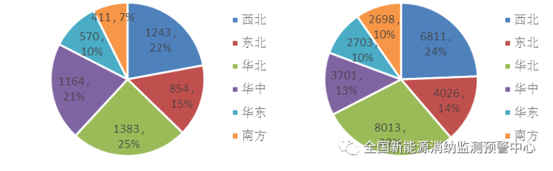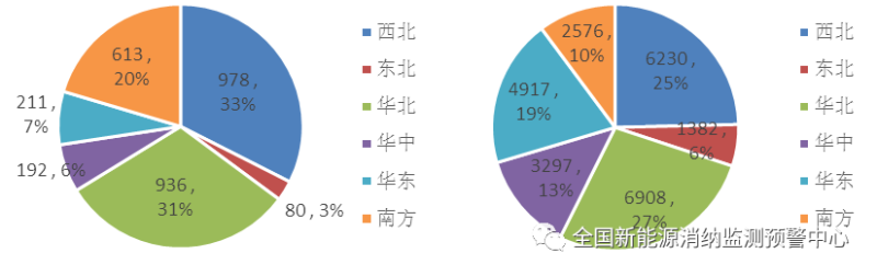 四季度各區(qū)域新增(左)、累計(右)并網(wǎng)光伏發(fā)電裝機(萬千瓦)