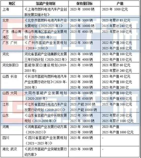 具體來看,據(jù)不完全統(tǒng)計(jì),僅上海、北京、廣東、山西、山東、江蘇、河北、河南、四川、湖北等十個(gè)省份及直轄市明確規(guī)劃(如下圖所示),2023/2025年燃料電池汽車保有量分別達(dá)到3.5萬輛和7.63萬輛。2020年底國內(nèi)燃料電池汽車保有量在8000輛左右,這意味著未來三年年均銷量需達(dá)到9000輛以上,未來五年年均銷量在13660輛以上。