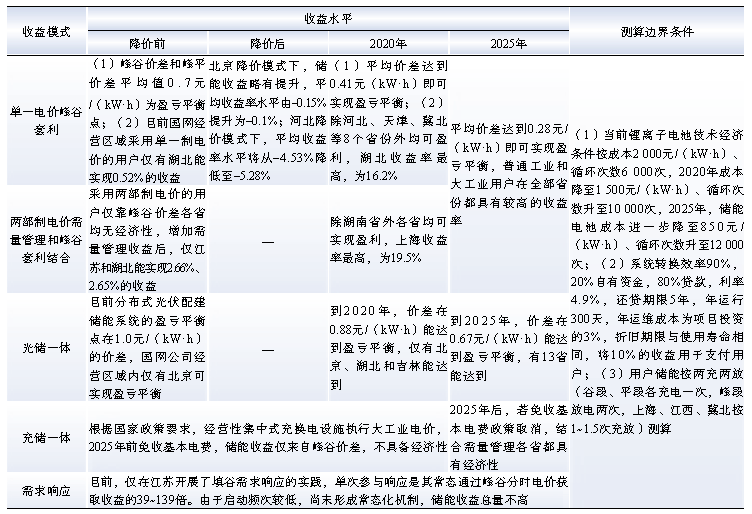 (3)對于客戶側(cè)儲能,需量管理和峰谷價差共同回收模式下,儲能盈利性水平主要與峰谷價差、儲能投資建設(shè)成本、循環(huán)次數(shù)、充放電模式、用戶分成比例以及對需量降低的效率影響等指標有關(guān)。通過建立儲能成本分析模式進行經(jīng)濟性測算,當(dāng)前,普通工業(yè)和大工業(yè)用戶安裝儲能僅少部分省份能實現(xiàn)盈虧平衡,隨著儲能技術(shù)經(jīng)濟性提升,按工業(yè)電價降價前目錄電價計算,2020年已具有較好的盈利性。按照2019年工業(yè)電價水平下降要求,在北京市降價模式下(峰、平、谷價格統(tǒng)一下降同一額度,峰谷價差和峰平價差保持不變),儲能收益略有提升,在多數(shù)省份采用的河北省降價模式下(下降比例基本相同,峰谷價差和峰平價差縮小),儲能收益將明顯下降。