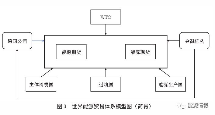 能源作為一類商品在世界范圍內(nèi)流通和貿(mào)易,從市場觀點出發(fā)進行能源問題分析具有重要價值。能源在市場中的主要形式有能源商品的現(xiàn)貨貿(mào)易、期貨貿(mào)易和能源技術(shù)的合作共享。世界能源貿(mào)易體系由能源生產(chǎn)國、過境國和主體消費國構(gòu)成,國際組織如世界貿(mào)易組織(WTO),架構(gòu)在上層進行統(tǒng)一指導(dǎo)和協(xié)調(diào)(見圖 3)。與此同時,金融機構(gòu)作為金融市場的重要參與者和中介服務(wù)機構(gòu)參與到能源貿(mào)易中;部分跨國公司由于自身業(yè)務(wù)涉及全球多個地區(qū)的市場,在國際貿(mào)易中能夠提供增值服務(wù)或具備參與優(yōu)勢,也會參與到能源貿(mào)易中。以 WTO 為代表的國際組織作為最上層的能源貿(mào)易協(xié)調(diào)和管理體系,對整個貿(mào)易條款的簽訂、貿(mào)易的實施環(huán)節(jié)進行管控。