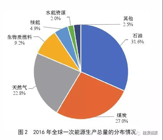 重塑世界能源體系需要各個國家共同努力和協(xié)作應(yīng)對,促使能源體系發(fā)生重大的根本性變革。盡管清潔能源、綠色能源的概念逐步被認(rèn)識并看好,但是化石能源的主導(dǎo)地位到目前為止依舊沒有出現(xiàn)明顯的減弱跡象。根據(jù)國際能源署(IEA)統(tǒng)計數(shù)據(jù)顯示(見圖 2),2016 年全球煤炭、石油、天然氣三大傳統(tǒng)化石能源占一次能源生產(chǎn)總量的比例高達 81.4%,仍居于絕對的核心和主導(dǎo)地位。