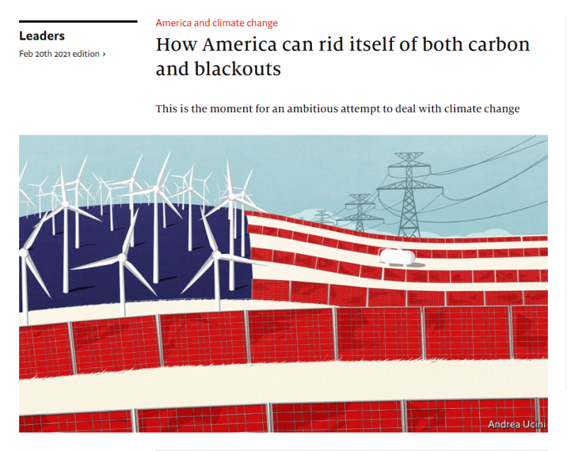 英國《經(jīng)濟(jì)學(xué)人》雜志發(fā)表文章,題目是:How America can rid itself of both carbon and blackouts(美國如何擺脫碳排放和停電)。