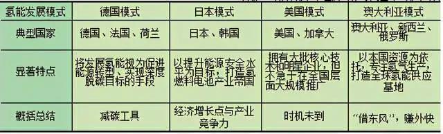 從不同國家發(fā)展氫能產(chǎn)業(yè)的出發(fā)點(diǎn)、側(cè)重點(diǎn)、著力點(diǎn)等方面看, 全球各國實踐大致可總結(jié)為四大類型,本文稱之為四種典型模式,即把氫能作為深度脫碳的重要工具的德國模式(法國、英國、荷蘭等國做法類似);把氫能作為新興產(chǎn)業(yè)制高點(diǎn)的日本模式(韓國做法類似);把氫能作為中長期戰(zhàn)略技術(shù)儲備的美國模式( 加拿大做法類似) 以及把氫能作為資源出口創(chuàng)匯新增長點(diǎn)的澳大利亞模式( 新西蘭、俄羅斯等國做法類似)。