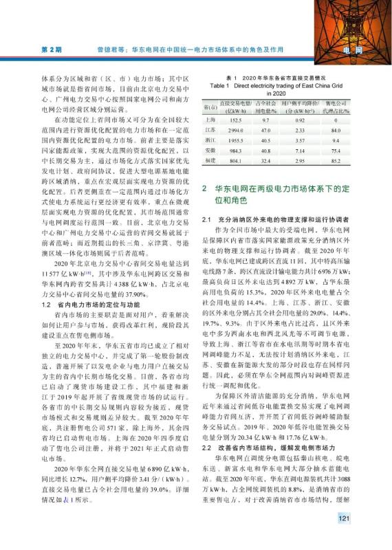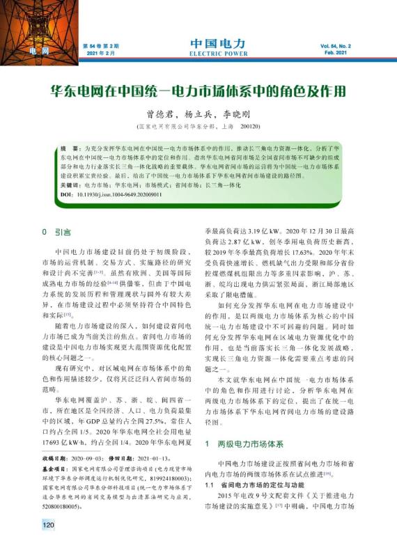 曾德君, 楊立兵, 李曉剛. 華東電網(wǎng)在中國統(tǒng)一電力市場體系中的角色及作用[J]. 中國電力, 2021, 54(2): 120-126.