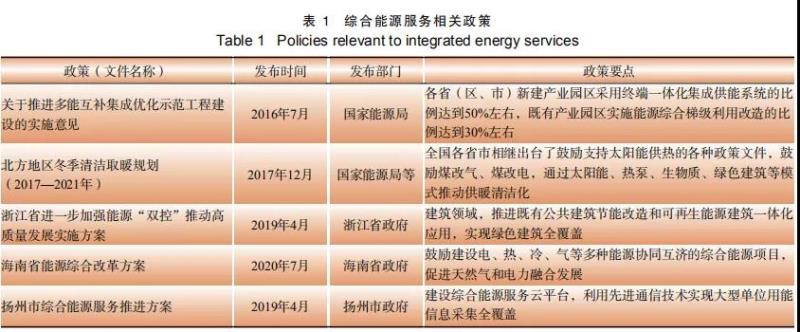 “十三五”期間,中央政府相繼出臺多能互補集成、清潔供暖等政策文件,浙江、海南等省政府也相繼發(fā)布能源強度和總量雙控、能源綜合改革方案等地方性指導(dǎo)意見,相關(guān)政策要點如表 1 所示。整體上看,近年來國家、地方省市政府高度關(guān)注綜合能源發(fā)展,支持政策呈現(xiàn)出鼓勵多能 互補一體化發(fā)展思路、關(guān)注產(chǎn)業(yè)規(guī)劃等特點。