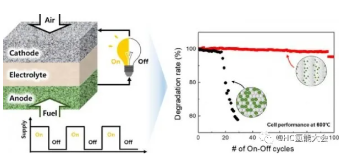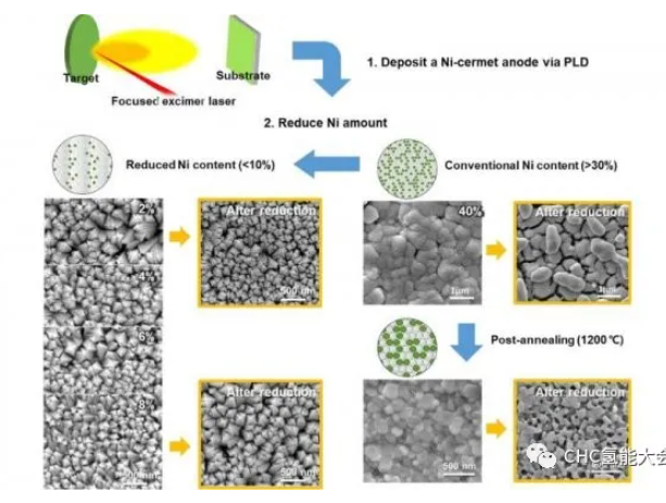 韓國科學技術研究院(KIST)的Jiwon Sohn博士的團隊開發(fā)了一種新的概念燃料電池,將鎳含量降低到2%,也就是現(xiàn)有陽極鎳含量的1/20,這樣陽極中的鎳顆粒就不會聚集在一起。通過將鎳催化劑的尺寸減小至納米水平,增加了表面積以補償催化劑含量的降低。同時尺寸非常小的催化劑顆粒薄而均勻地分布在陽極薄膜層中,能夠防止鎳顆粒匯聚的過程。