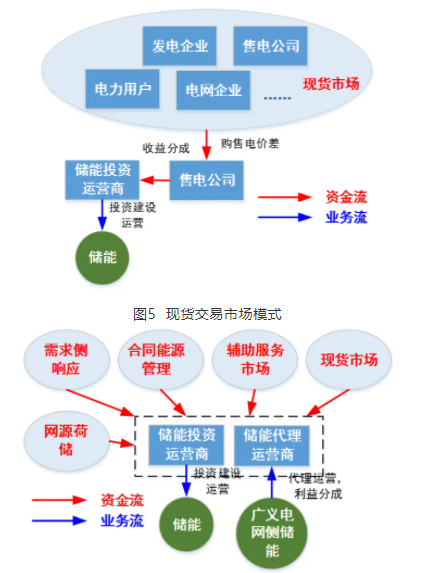 競(jìng)爭(zhēng)性業(yè)務(wù)模式適用于提供調(diào)頻等輔助服務(wù)、移峰填谷和提高新能源利用水平三類場(chǎng)景的電網(wǎng)側(cè)儲(chǔ)能應(yīng)用,按照投資回收方式不同,該商業(yè)模式又可細(xì)分為合同能源管理模式、兩部制電價(jià)模式、輔助服務(wù)市場(chǎng)模式、現(xiàn)貨交易市場(chǎng)模式和綜合模式。競(jìng)爭(zhēng)性業(yè)務(wù)模式由可參與市場(chǎng)競(jìng)爭(zhēng)的社會(huì)資本投資,業(yè)務(wù)受輸配電價(jià)監(jiān)管的電網(wǎng)主業(yè)不允許投資。各商業(yè)模式的關(guān)系示意圖如圖2~圖6所示。