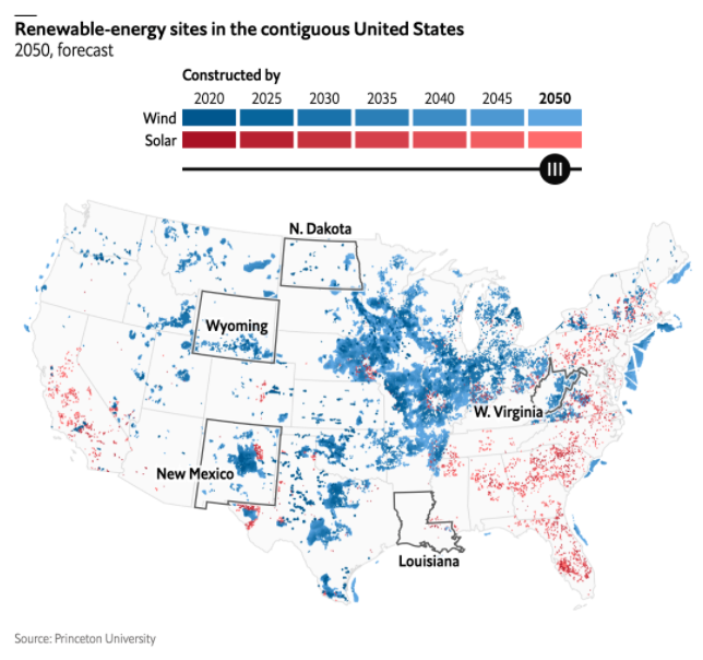 到2050年,預(yù)計美國輸電和可再生能源的將大幅度擴張。屆時,美國陸上風(fēng)電場和太陽能發(fā)電場將占地約60萬平方公里,面積略小于兩個新墨西哥州,略大于明尼蘇達州、威斯康星州和伊利諾伊州的總和。即便如此,這依然也不夠,必須加大力度探索各種能源方式的最佳組合,以提供電網(wǎng)所需的可靠容量。