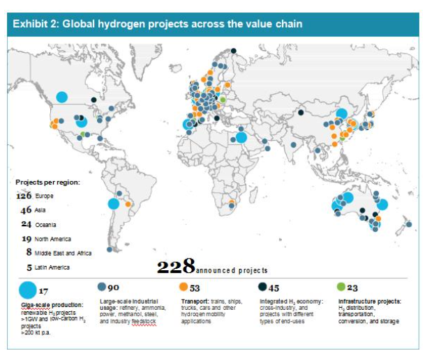 目前,在全球范圍內(nèi),價值鏈上有228個氫項目,85%的全球項目來自歐洲、亞洲和澳大利亞,美洲、中東和北非正在加速部署。
