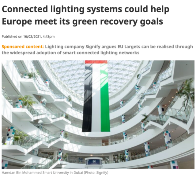 中國儲能網(wǎng)訊:據(jù)ClimateNews網(wǎng)站報道,照明燈具公司Signify認為,廣泛采用智能連接的照明網(wǎng)絡可推動實現(xiàn)綠色轉型和碳中和。2018年,該公司在迪拜的哈姆丹·本·穆罕默德智能大學(HBMSU)安裝了最先進的聯(lián)網(wǎng)照明系統(tǒng),這是一個沒有電燈開關的學習環(huán)境。