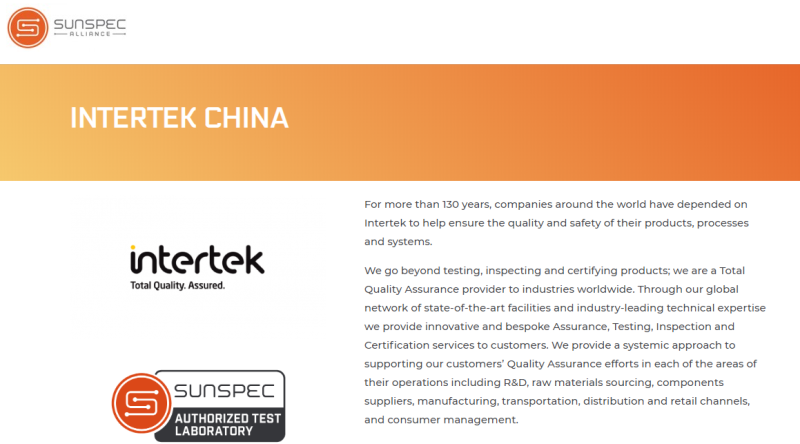 Intertek 天祥集團(tuán)在廣州的實(shí)驗(yàn)室正式成為SunSpec聯(lián)盟授權(quán)實(shí)驗(yàn)室,即日起可為廣大客戶進(jìn)行SunSpec相關(guān)測(cè)試認(rèn)證服務(wù),助力光伏分布式能源系統(tǒng)智能化調(diào)控。Intertek 中國(guó)可再生能源部門(mén)擁有全套逆變器、儲(chǔ)能變流器、零配件和儲(chǔ)能系統(tǒng)檢測(cè)設(shè)備,同時(shí)擁有EMC實(shí)驗(yàn)室,步入式環(huán)境實(shí)驗(yàn)室和外殼防護(hù)等級(jí) (IP等級(jí)) 測(cè)試實(shí)驗(yàn)室 ,是IEC (國(guó)際電工委員會(huì)),CNAS (中國(guó)合格評(píng)定國(guó)家認(rèn)可委員會(huì)),OSHA (美國(guó)職業(yè)安全和健康署) 認(rèn)可實(shí)驗(yàn)室。成為SunSpec授權(quán)實(shí)驗(yàn)室后Intertek將為可再生能源領(lǐng)域客戶帶來(lái)更多優(yōu)質(zhì)高效的本土化服務(wù)。