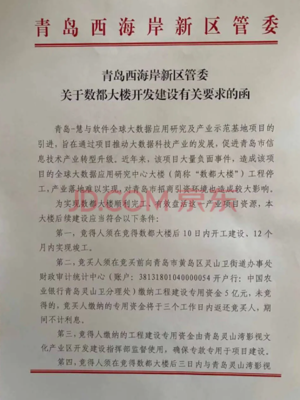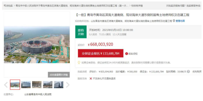 從現(xiàn)場(chǎng)照片看,建筑主體已基本完工。而此次拍賣目的也為青島西海岸新區(qū)管委為繼續(xù)完成“中國(guó)數(shù)都”項(xiàng)目,盤活資產(chǎn)而進(jìn)行。