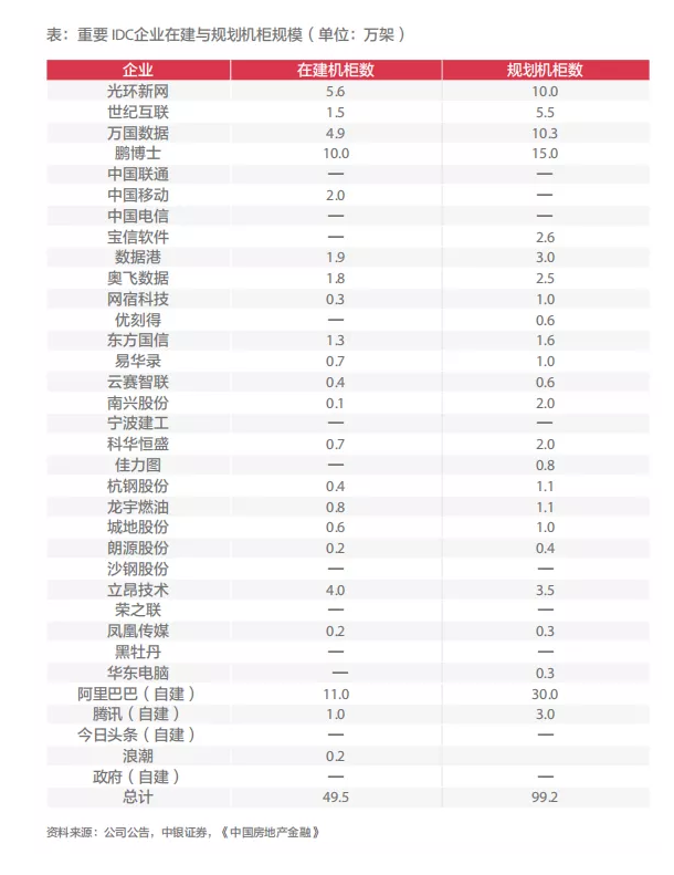 貴州在2020 年重點(diǎn)建設(shè)“中國南方數(shù)據(jù)中心示范基地”,重慶市2020 年投資超過67 億元新投建5 個(gè)數(shù)據(jù)中心項(xiàng)目,山東將在2022 年年底前打造30 個(gè)以上綠色數(shù)據(jù)中心。企業(yè)層面,總投資109 億元的華為成都數(shù)據(jù)中心日前簽約,阿里云宣布未來3 年再投2000 億元,用于數(shù)據(jù)中心建設(shè)以及重點(diǎn)技術(shù)研發(fā),騰訊未來五年將投資5000 億元,其中數(shù)據(jù)中心是投資重點(diǎn),包括在天津?yàn)I海高新區(qū)打造全國最大IDC 數(shù)據(jù)機(jī)房等。