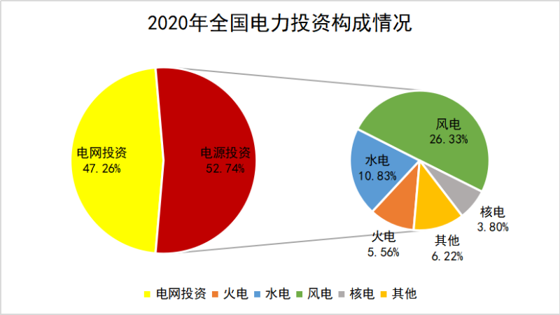 2020年,全國電力投資累計9944億元,同比增長9.6%。電源工程建設(shè)完成投資5244億元,同比增長29.2%,其中水電、火電、核電和風(fēng)電投資分別完成1077、553、378和2618億元,同比分別增長19.0%、-27.3%、-22.6%和70.6%;電網(wǎng)工程建設(shè)完成投資4699億元,同比減少6.2%。下圖是2020年全國電力投資構(gòu)成情況。