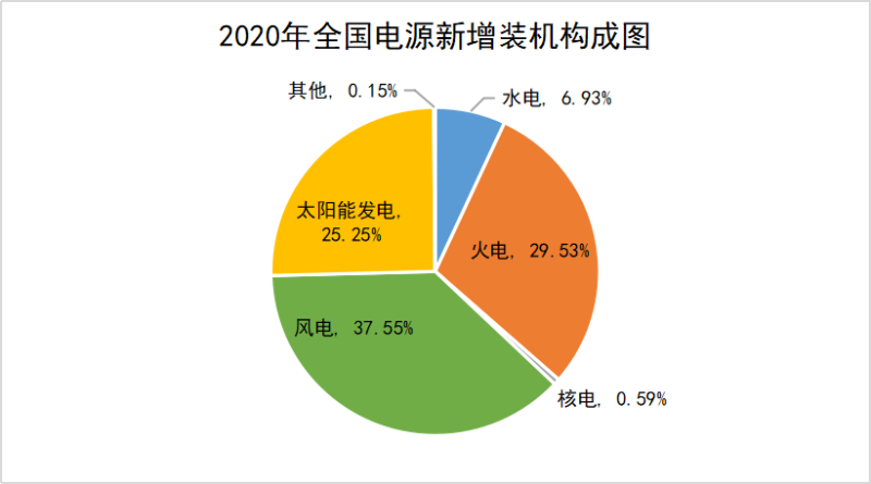 2020年,全國基建新增發(fā)電設(shè)備容量19087萬千瓦。其中,水電1323萬千瓦、占全部新增裝機的6.93%;火電5637萬千瓦,占全部新增裝機的29.53%;核電112萬千瓦,占全部新增裝機的0.59%;太陽能發(fā)電4820萬千瓦,占全部新增裝機的25.25%;并網(wǎng)風(fēng)電(7167萬千瓦)新增裝機創(chuàng)歷史新高,占全部新增裝機的37.55%。各類型電源新增裝機構(gòu)成如下圖: