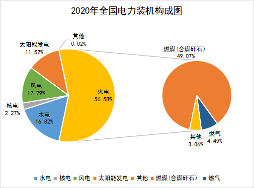 截至2020年底,全國發(fā)電裝機容量22億千瓦,同比增長9.5%,“十三五”期間年均增長7.6%,高于電力“十三五”規(guī)劃目標(biāo)(發(fā)電裝機容量20億千瓦,年均增長5.5%)。分類型看,截至2020年底,全國水電裝機37016萬千瓦、火電124517萬千瓦、核電4989萬千瓦、并網(wǎng)風(fēng)電28153萬千瓦、并網(wǎng)太陽能發(fā)電25343萬千瓦。具體構(gòu)成見下圖: