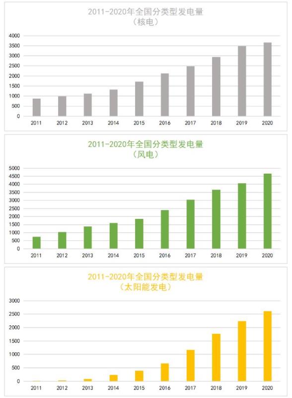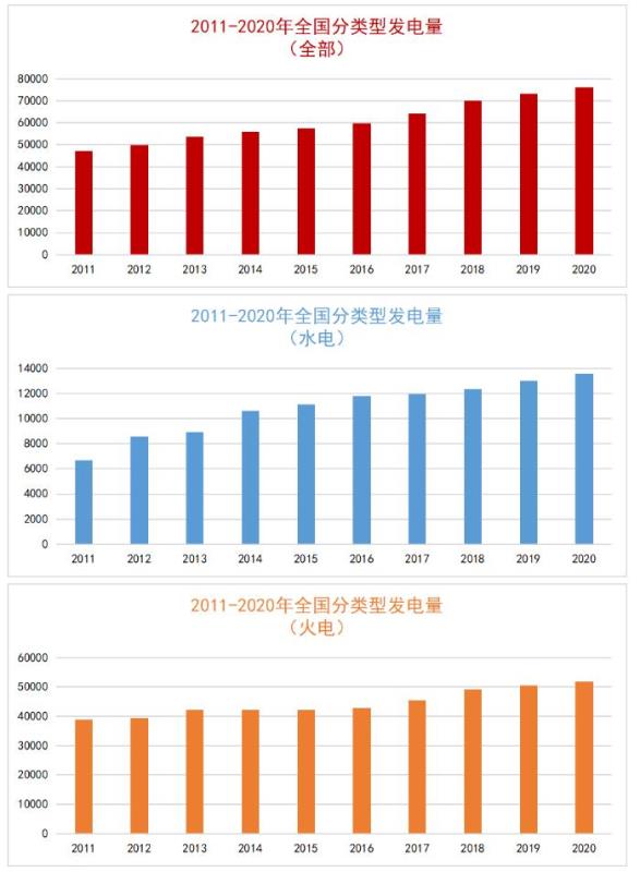 以下是2011-2020年全國各類型發(fā)電量情況。
