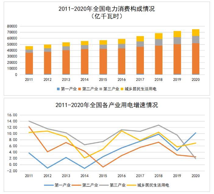 分產(chǎn)業(yè)看,2020年,全國第一、二、三產(chǎn)業(yè)和城鄉(xiāng)居民生活用電量分別為859、51215、12087和10950億千瓦時,同比分別增長10.2%、2.5%、1.9%和6.9%。2011-2020年全國各產(chǎn)業(yè)用電量及其增速情況盤點如下: