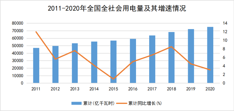 2020年,全國全社會用電量7.5萬億千瓦時,十三五期間年均增長5.7%,高于電力發(fā)展十三五規(guī)劃中“預(yù)期2020年全社會用電量6.8-7.2萬億千瓦時,年均增長3.6-4.8%”的目標(biāo)。2011-2020年全國全社會用電量及其增速情況如下圖。