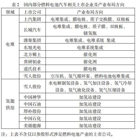 2017 年以來,上汽集團、濰柴集團、長城集團、雪人 股份等國內(nèi)大型企業(yè)紛紛調(diào)整業(yè)務戰(zhàn)略或增加業(yè)務版塊,快 速布局氫能與氫燃料電池核心零部件產(chǎn)業(yè),其中上市公司超 過 30 家。大型企業(yè)集團進入燃料電池核心零部件產(chǎn)業(yè),憑 借資金實力和渠道優(yōu)勢以及大規(guī)模的研發(fā)和產(chǎn)業(yè)投入,加速 了產(chǎn)業(yè)鏈的構建和集聚,加快了燃料電池汽車國產(chǎn)重要部件 性能提升和規(guī)?;a(chǎn)的時間表。國內(nèi)部分燃料電池汽車相 關上市企業(yè)及產(chǎn)業(yè)布局方向如表 2 所示。