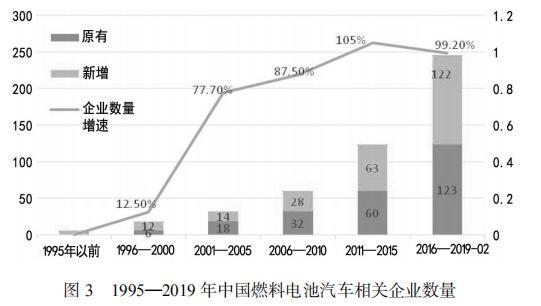 圖 3 給出了 1995—2019 年中國燃料電池汽車相關企業(yè) 數(shù)量。截至 2019-02,中國燃料電池汽車相關企業(yè)數(shù)量近 250 家,其中近三年來相關企業(yè)數(shù)量增速加快,并初步形成了長 三角、華南及環(huán)京幾大產(chǎn)業(yè)集聚區(qū)。另外,中部、西部、東 北一些電動汽車產(chǎn)業(yè)相對落后,或工業(yè)副產(chǎn)氫以及光電水電 資源較為豐富,以及氣候極寒等地區(qū),也是布局燃料電池汽 車產(chǎn)業(yè)的重要區(qū)域。