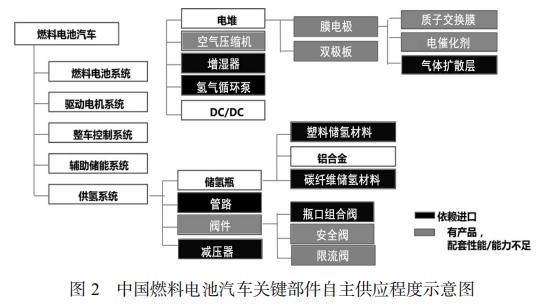 如圖 2 所示,圖中黑色陰影部分的產(chǎn)品是目前國內(nèi)產(chǎn)業(yè) 空白,完全依賴進口的產(chǎn)品,灰色陰影部分代表國內(nèi)雖然有 相應產(chǎn)品,但由于性能不足或車標配套能力不足,目前階段 也主要依賴于進口的領域,在燃料電池汽車核心部件方面, 中國目前主要掌握的是電堆和電堆系統(tǒng)的集成、車載儲氫瓶 的集成。