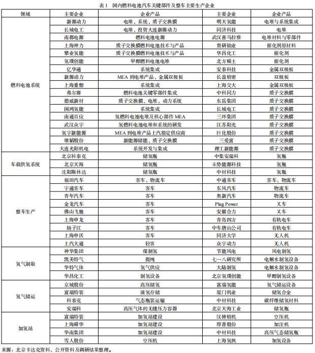 燃料電池汽車產(chǎn)業(yè)鏈內(nèi),已經(jīng)集聚了數(shù)量較多的國內(nèi)生 產(chǎn)企業(yè)。國內(nèi)燃料電池汽車關鍵部件及整車主要生產(chǎn)企業(yè)如表 1 所示。