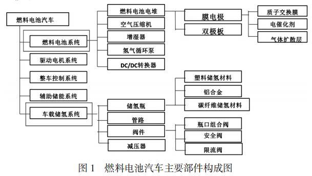 燃料電池汽車產(chǎn)業(yè)鏈主要包含上游(燃料電池動力系統(tǒng) 及關鍵部件)和下游(整車生產(chǎn))兩大部分。與傳統(tǒng)汽車產(chǎn) 業(yè)鏈相比,燃料電池汽車產(chǎn)業(yè)鏈主要新增了燃料電池系統(tǒng)和 車載供氫系統(tǒng),其中燃料電池系統(tǒng)是核心結構。主要部件構 成如圖 1 所示。