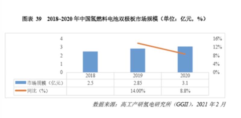 近日,高工產(chǎn)研氫電研究所(GGII)正式發(fā)布的《2021年中國(guó)氫電產(chǎn)業(yè)發(fā)展藍(lán)皮書(1.0版)》顯示,2020年國(guó)內(nèi)氫燃料電池雙極板市場(chǎng)規(guī)模約為3.1億元,同比增長(zhǎng)8.8%,增長(zhǎng)的主要原因是2020年國(guó)內(nèi)外電堆出貨量的增長(zhǎng)。