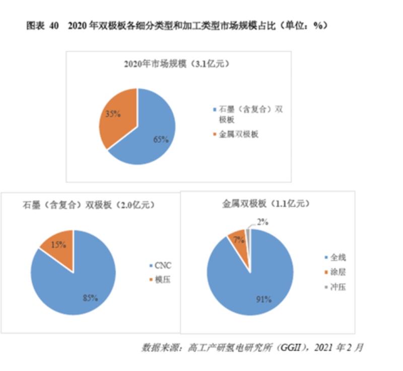 從雙極板的加工工藝來看,現(xiàn)階段石墨雙極板的加工形式有CNC和模壓兩種,2020年采用CNC工藝路線的石墨雙極板市場(chǎng)規(guī)模占比達(dá)到85%,仍是當(dāng)下的主流;另一方面,采用模壓工藝的石墨雙極板市場(chǎng)占比從2019年的不足10%,提升到15%左右,有了顯著的增長(zhǎng)。
