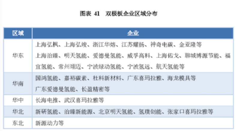 從布局雙極板的企業(yè)來看,石墨雙極板企業(yè)在我國(guó)的華東、華南、華中、華北和東北都有所分布,其中華東地區(qū)的雙極板企業(yè)數(shù)量最多,也是國(guó)內(nèi)石墨雙極板和金屬雙極板生產(chǎn)最為集中的地區(qū)。國(guó)內(nèi)主要的石墨雙極板企業(yè)上海弘楓、上海弘竣、浙江華熔和金屬雙極板企業(yè)上海治臻都位于華東地區(qū);華南的嘉裕碳素,華中的長(zhǎng)海電推、武漢喜瑪拉雅都涉足布局雙極板。