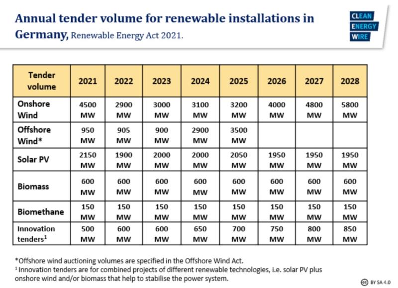 新的EEG計劃將太陽能光伏發(fā)電量提高到100吉瓦(目前約52吉瓦),陸上風電增加到71吉瓦(目前55吉瓦),生物質(zhì)增加到8.4吉瓦,海上風電增加到2吉瓦。每年還有額外的500-850兆瓦將通過的“創(chuàng)新競標”進行投標,不針對具體技術(shù),陸上風能、太陽能光伏、生物質(zhì)和/或儲能裝置的組合將共同穩(wěn)定電力系統(tǒng)。