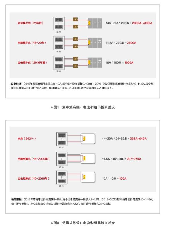 1)為進(jìn)一步降低光伏電站LCOE,光伏組件呈現(xiàn)大功率、大電流趨勢(shì)。隨著硅片尺寸越來越大以及電池效率越來越高,組件電流不斷提高成為必然趨勢(shì)。我們看到,組件電流越來越大,逆變器功率或匯流箱對(duì)應(yīng)的組串?dāng)?shù)量也不斷增加。