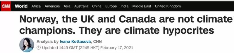 美國(guó)有線電視新聞網(wǎng)(CNN)發(fā)表伊萬娜·科塔索娃(Ivana Kottasová)的分析Norway, the UK and Canada are not climate champions. They are climate hypocrites(挪威、英國(guó)和加拿大不是氣候冠軍,是偽君子)。