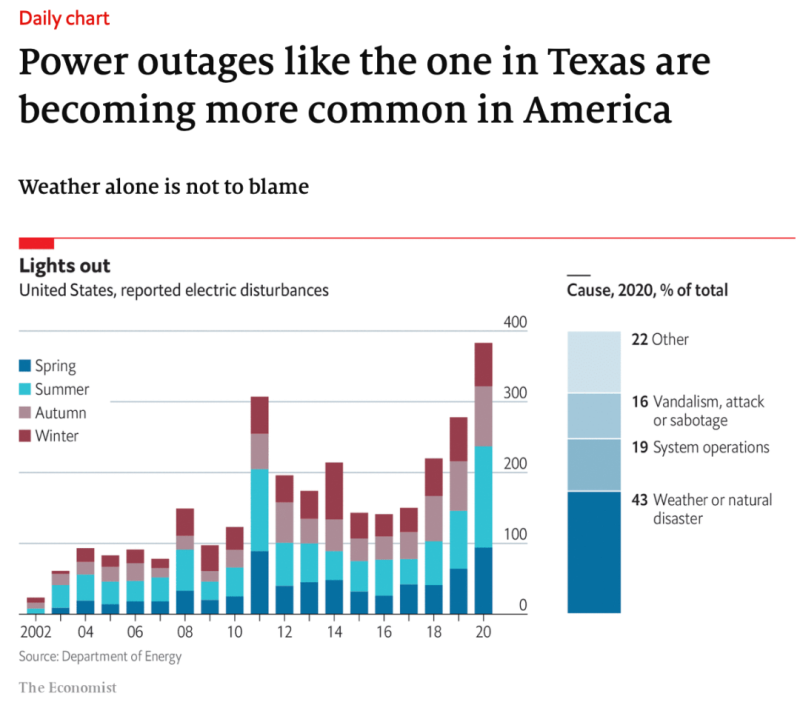 當時,一場冬季風暴導致全州斷電,數(shù)百萬德克薩斯人陷入黑暗??藗愋け娮h員警告說:“這引起了人們對極端天氣下依賴可再生能源的電網(wǎng)可靠性的嚴重擔憂。” 盡管克倫肖先生單挑可再生能源是錯誤的,因為天然氣管道、核反應堆和輸電線路在風暴期間也結冰了,但是他對美國電網(wǎng)的擔憂是合理的。在美國,停電的情況越來越多,也不能光是怪罪于天氣。