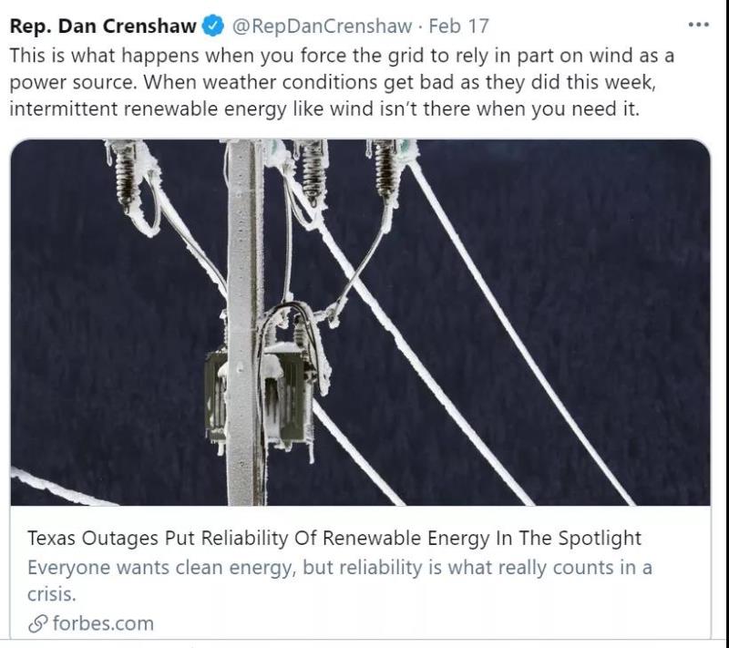 據(jù)《經濟學人》報道,美國德克薩斯州的共和黨眾議員丹·克倫肖(DAN CRENSHAW)在2月17日的推特上說:“間歇性的可再生能源,如風能,在你需要的時候是不存在的?!?