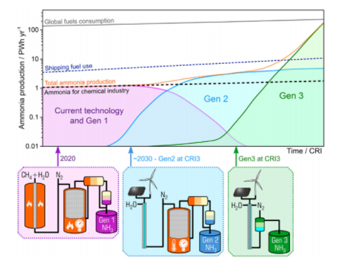 這幅氨經(jīng)濟路線圖顯示了第1代(紫色)、第2代(淺藍色)和第3代(綠色)氨生產(chǎn)技術當前和預期的貢獻。