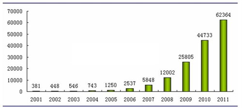 2001-2011 年中國風(fēng)電行業(yè)累計(jì)裝機(jī)容量(單位:MW)