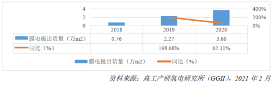 2月22日,高工產(chǎn)研氫電研究所(GGII)正式發(fā)布《2021年中國(guó)氫電產(chǎn)業(yè)發(fā)展藍(lán)皮書(shū)(1.0版)》。該藍(lán)皮書(shū)顯示,2020年國(guó)內(nèi)市場(chǎng)膜電極出貨量為3.68萬(wàn)m2,同比增長(zhǎng)62.11%,增長(zhǎng)動(dòng)力主要來(lái)自下游電堆生產(chǎn)量增長(zhǎng)。結(jié)合2018年、2019年出貨量分別為0.76萬(wàn)m2、2.27萬(wàn)m2來(lái)看,得益于下游市場(chǎng)需求的提高,近三年國(guó)內(nèi)市場(chǎng)膜電極出貨量一直處于穩(wěn)步增長(zhǎng)態(tài)勢(shì)。