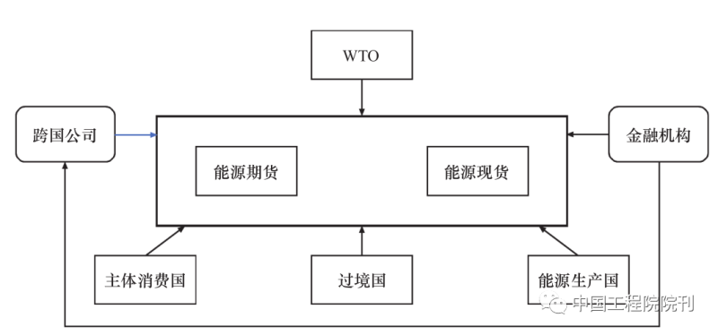 能源作為一類商品在世界范圍內(nèi)流通和貿(mào)易,從市場(chǎng)觀點(diǎn)出發(fā)進(jìn)行能源問(wèn)題分析具有重要價(jià)值。能源在市場(chǎng)中的主要形式有能源商品的現(xiàn)貨貿(mào)易、期貨貿(mào)易和能源技術(shù)的合作共享。世界能源貿(mào)易體系由能源生產(chǎn)國(guó)、過(guò)境國(guó)和主體消費(fèi)國(guó)構(gòu)成,國(guó)際組織如世界貿(mào)易組織(WTO),架構(gòu)在上層進(jìn)行統(tǒng)一指導(dǎo)和協(xié)調(diào)(見(jiàn)圖3)。與此同時(shí),金融機(jī)構(gòu)作為金融市場(chǎng)的重要參與者和中介服務(wù)機(jī)構(gòu)參與到能源貿(mào)易中;部分跨國(guó)公司由于自身業(yè)務(wù)涉及全球多個(gè)地區(qū)的市場(chǎng),在國(guó)際貿(mào)易中能夠提供增值服務(wù)或具備參與優(yōu)勢(shì),也會(huì)參與到能源貿(mào)易中。以WTO為代表的國(guó)際組織作為最上層的能源貿(mào)易協(xié)調(diào)和管理體系,對(duì)整個(gè)貿(mào)易條款的簽訂、貿(mào)易的實(shí)施環(huán)節(jié)進(jìn)行管控。