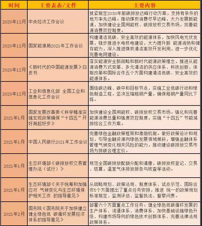 國家發(fā)展改革委、生態(tài)環(huán)境部、工信部、國家能源局、中國人民銀行等部委和單位相繼出臺文件,從發(fā)展清潔能源、完善碳排放權(quán)交易市場、壓縮粗鋼產(chǎn)量、落實(shí)總量和強(qiáng)度雙控制度、建立綠色金融政策框架等方面引導(dǎo)碳達(dá)峰、碳中和工作開展(詳見表1)。
