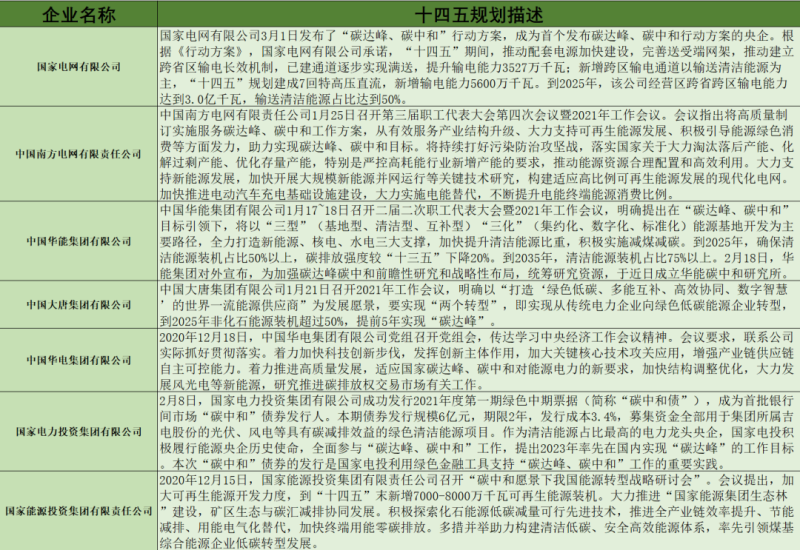 各省市區(qū)“十四五”規(guī)劃出爐,綠色低碳發(fā)展各盡所長,結(jié)合自身區(qū)位稟賦和產(chǎn)業(yè)結(jié)構(gòu)特點(diǎn)制定了碳減排相關(guān)的政策和目標(biāo),國家電網(wǎng)、中國大唐集團(tuán)、中國華能集團(tuán)、國家能源集團(tuán)等能源央企也做出了具體安排。(詳見表2、表3)。
