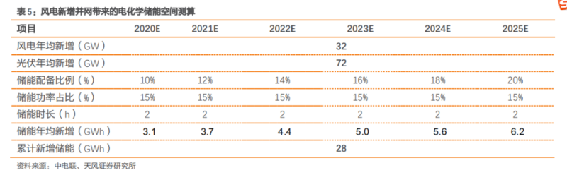 在能源結(jié)構(gòu)轉(zhuǎn)型,新能源裝機(jī)高增,各地政府要求配置儲(chǔ)能的背景下,我們對(duì)我國(guó)新能源并網(wǎng)帶來(lái)的儲(chǔ)能空間進(jìn)行測(cè)算。預(yù)計(jì) 2020-2025 年間,風(fēng)電、光伏并網(wǎng)帶來(lái)的新增儲(chǔ)能需求合計(jì)為 28GWh,年均新增儲(chǔ)能需求為 4.7GWh。測(cè)算假設(shè):①新增裝機(jī):根據(jù)表 3 的測(cè)算結(jié)果,假定 2020-2025 年,風(fēng)電光伏新增裝機(jī)呈線性增長(zhǎng),每年合計(jì)新增裝機(jī)規(guī)模 104GW;②儲(chǔ)能配比率:從 2020 年各地要求的儲(chǔ)能配比率來(lái)看,最低配比要求 5%,最高配比要求 20%。我們假定 2020 年實(shí)現(xiàn)配比率 10%,以后每年配比率逐漸上升 2pct,至 2025 年實(shí)現(xiàn)配比率 20%;③儲(chǔ)能功率占比:根據(jù)現(xiàn)有儲(chǔ)能項(xiàng)目功率配比情況,假設(shè)為 15%;④儲(chǔ)能時(shí)長(zhǎng):按 2h 的平均備電時(shí)長(zhǎng)作為估算值。