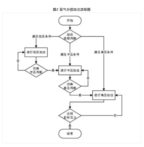 其中,氣源階梯切換的判斷常以氣瓶內(nèi)平均壓力變化速率為依據(jù),進而可按照低級瓶組到中級瓶組再到高級瓶組的順序從各級儲氫罐中取氣,按照此方式也提高了各級儲氫罐中的氫利用率。氫氣的分級加注流程如圖2所示。
